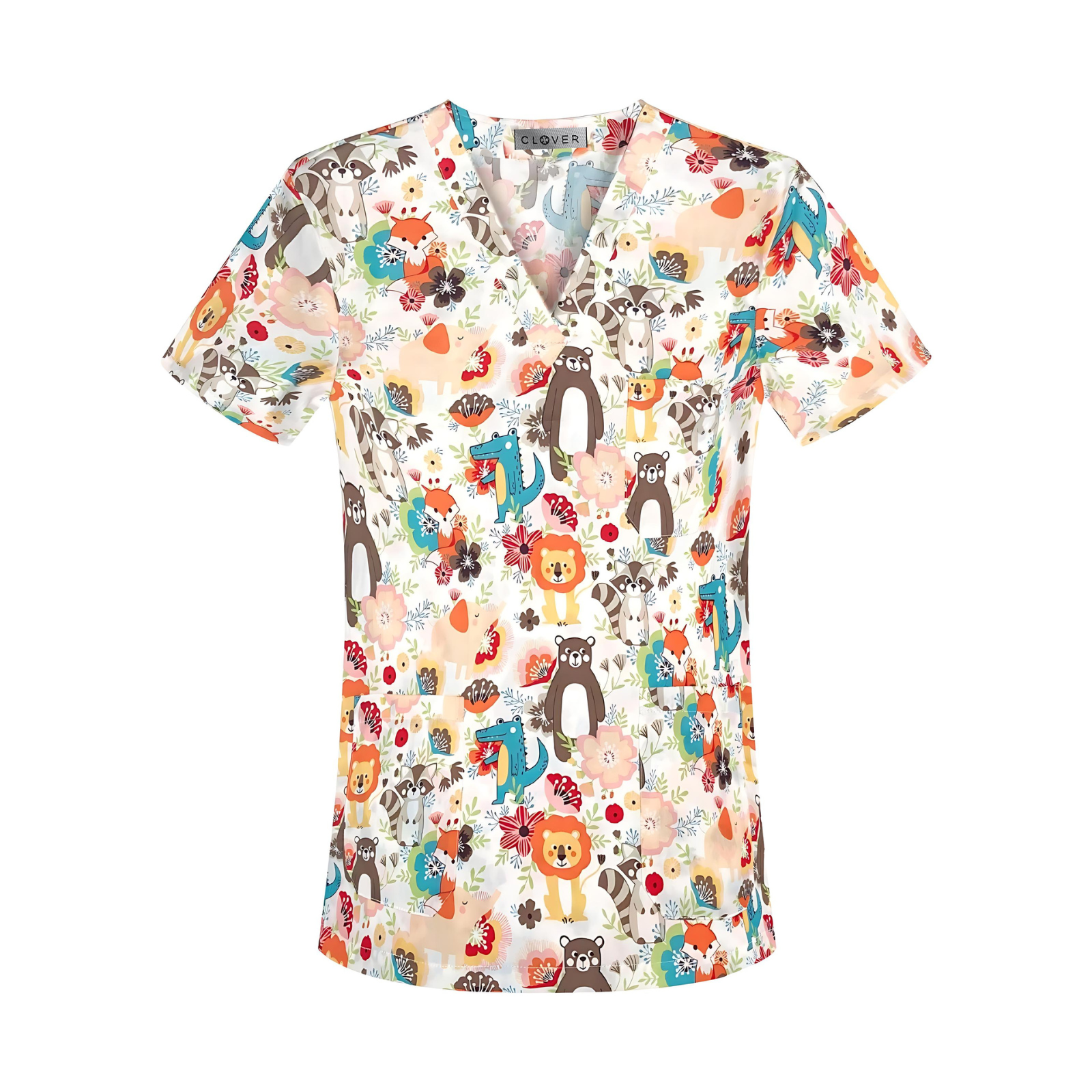 Brighten your workday with our Petal Friends Scrub Top! This charming ensemble combines the beauty of blooming flowers with the playful spirit of adorable animals, creating a delightful and eye-catching design.
